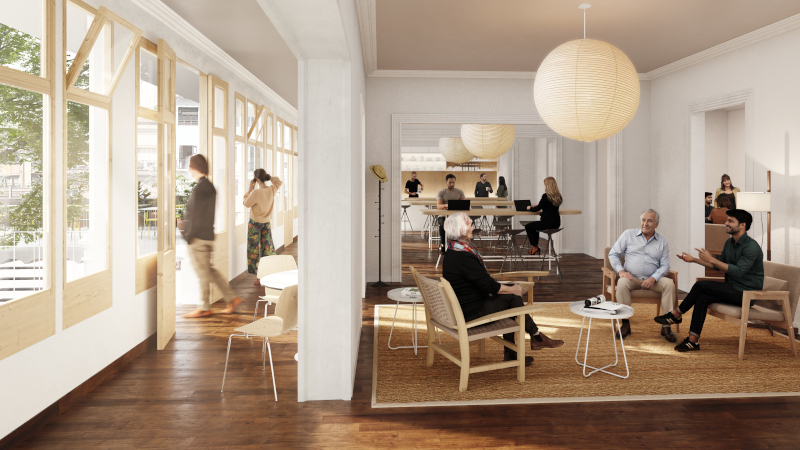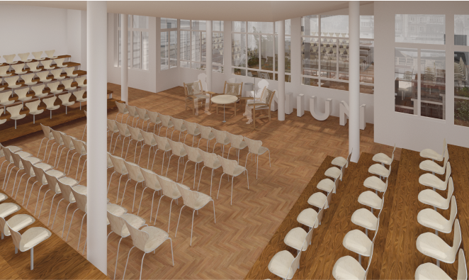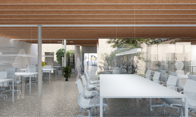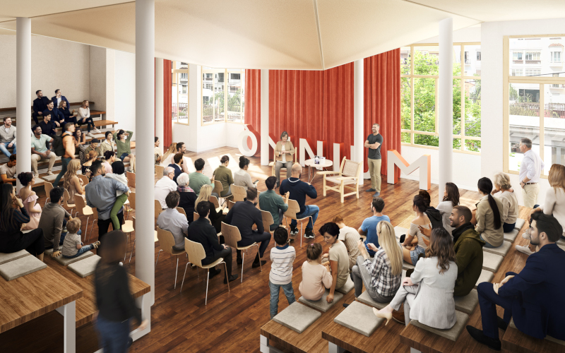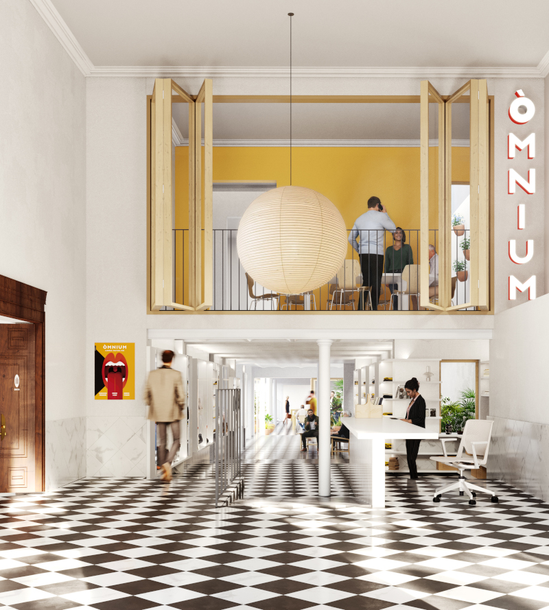La conceptualització que planteja Leve reformula els espais de la Seu Nacional des del pragmatisme col·lectiu i la utilitat dels diferents espais. L'estudi aposta per treure molt més partit del pati interior d'Òmnium, convertint-lo en l'espai social central de l'entitat de manera que ofereixi llum natural a totes les plantes.